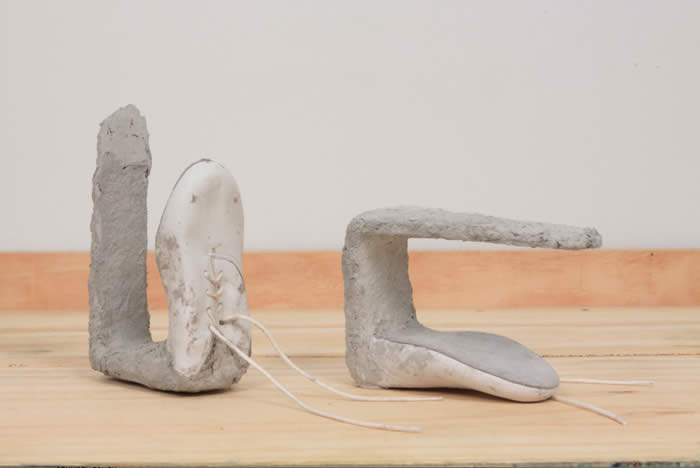 Jennifer Cohen, Untitled (pair) 2008, celluclay, cement, glue, leather shoes,