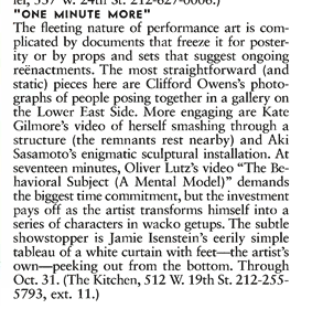 The New Yorker, "One Minute More at The Kitchen", Nov. 2, 2009.