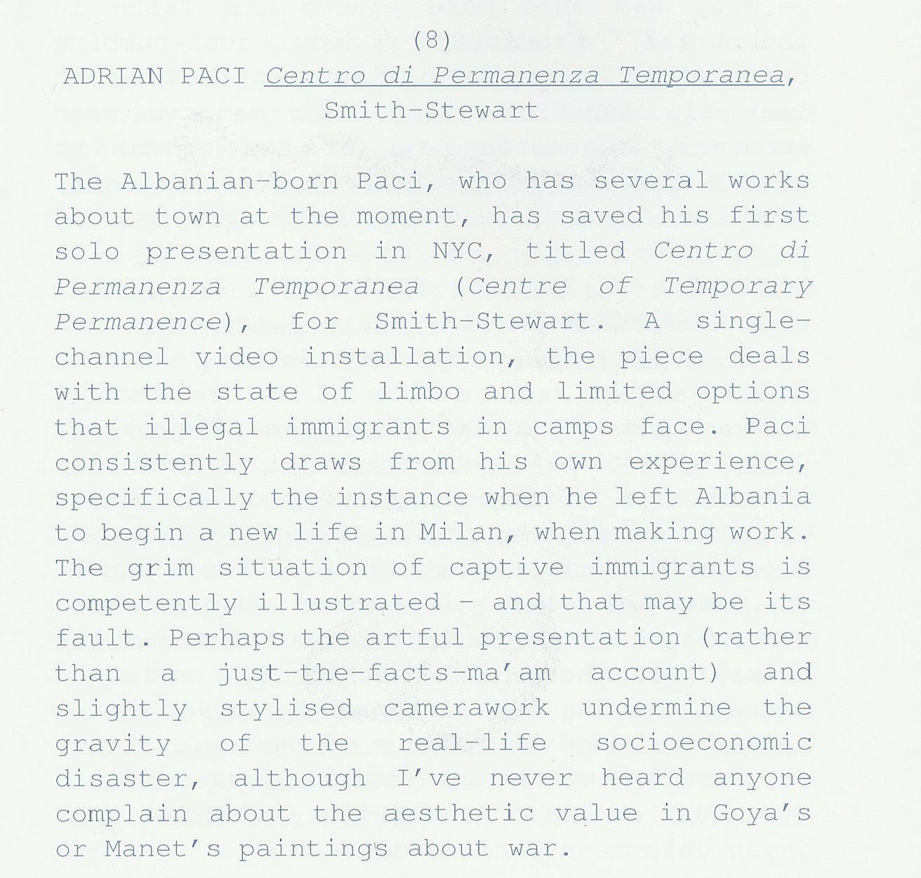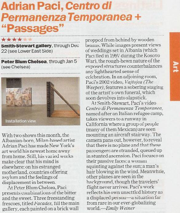Time Out New York: "Adrian Paci Review", Nov. 29-Dec. 5, 2007, by Emily Weiner.