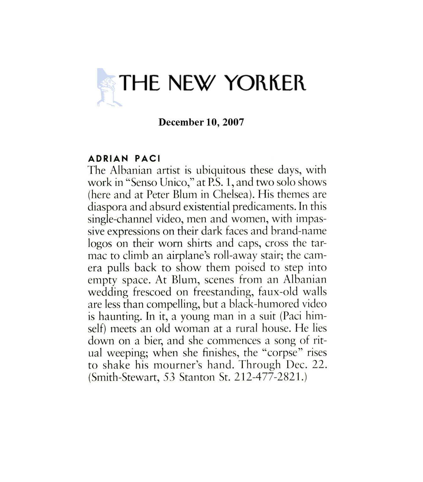 The New York Times, "Adrian Paci Review", Nov 30, 2007, by Roberta Smith, p. E38.
