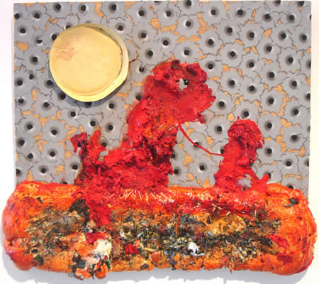 Oil paint and mixed media on wood, 17 x 18.5 in.