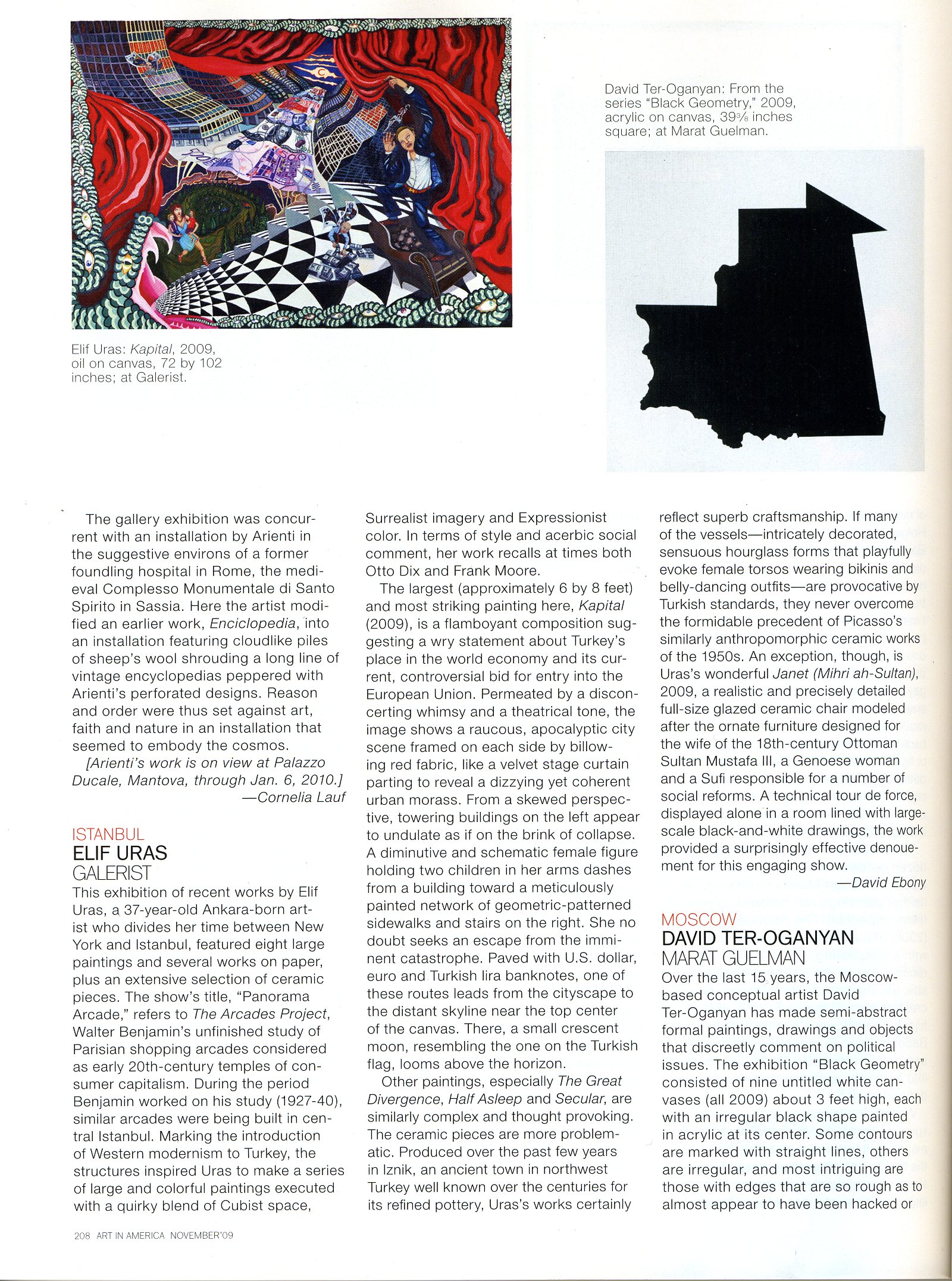 Art in America, "Elif Uras @ Galerist, Istanbul (review)," by David Ebony, pg. 208, November 2009.