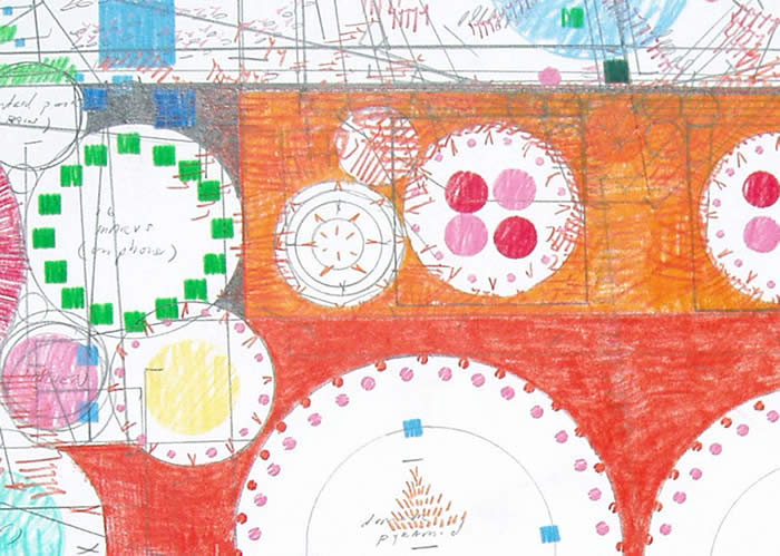 Brian Lund, "Combined Edit Cuts Featuring Sweet Charity and Wall Street #1" (detail), 2009, Graphite and colored pencil on paper, 50 x 38 inches.