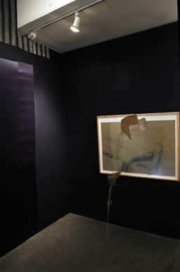Pencil, tempera and foam on paper, fabric panels and reeds