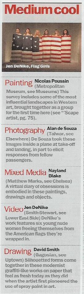 Time Out New York, "Medium Cool: Video Jen DeNike @ Smith-Stewart, Feb. 7-19, 2008, pg. 79.