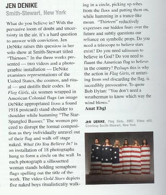 Flash Art, Review: Jen DeNike @ Smith-Stewart, May-June 2008, by Anat Egbi, pg. 162.